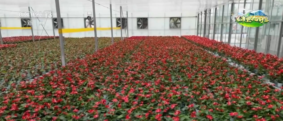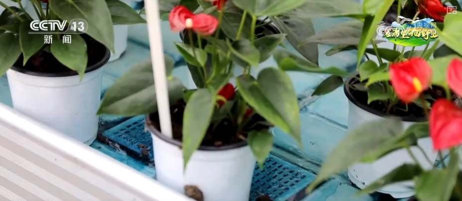 在这处花卉基地内,苗床上,红掌花争相绽放;苗床下,水流在托盘中有规律地起伏。这是一套“潮汐灌溉系统”,可以实现水肥精准调控,让花卉根据自身需要“喝水”“吃饭”。工作人员打开手机里的智慧农业数字化管理软件,就可以查看大棚的情况。